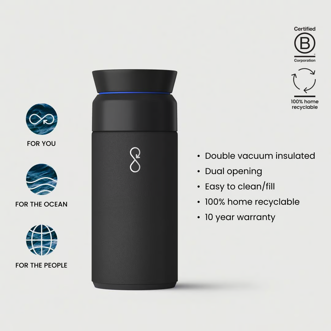 • Includes embedded NFC base plate which can be scanned to track refills and fund further plastic collection through the Ocean Bottle app (no further cost to user)